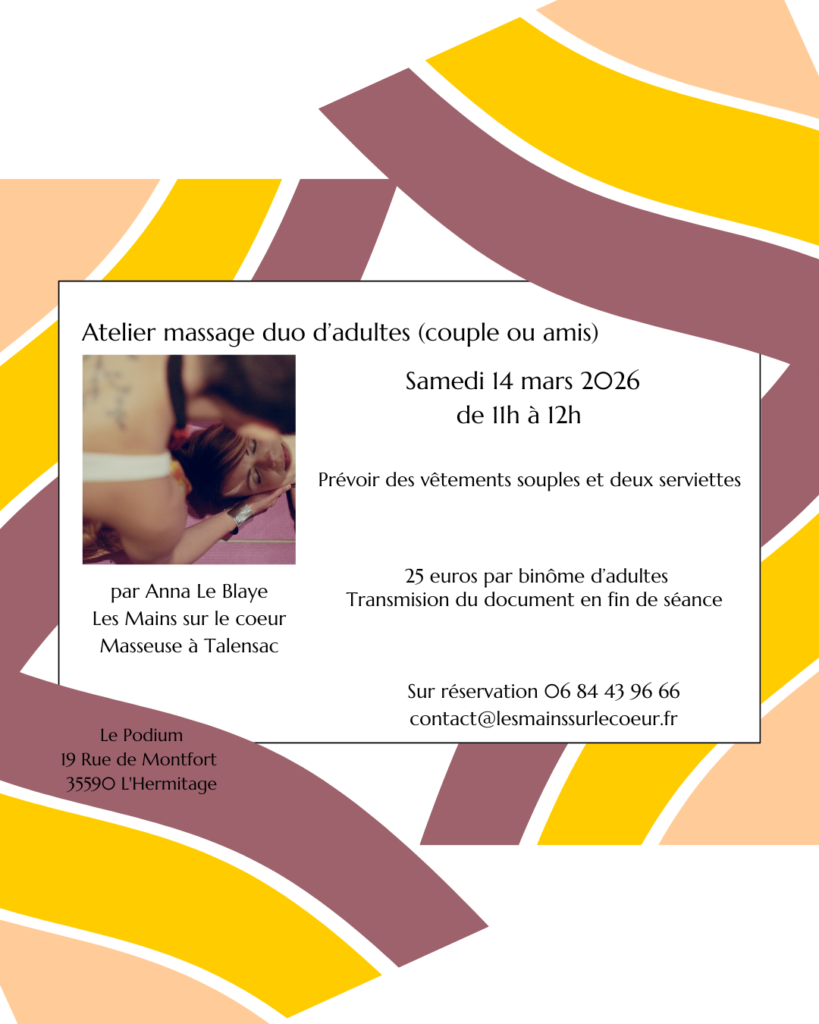 Je propose cet atelier au Podium, 19 Rue de Montfort, 35590 L’Hermitage le samedi 14 mars 2026, de 11h à 12h, 25e par binôme.